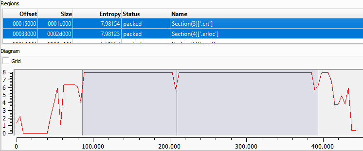 Using Detect It Easy, two sections of the provided file show some irregularities. The .crt section reaches a high entropy value of 7.98 & .erloc also reaches 7.98. Moreover, the diagram shows a constant flat area on both functions with no spikes. This indicates two encrypted sections and the presence of a packer.