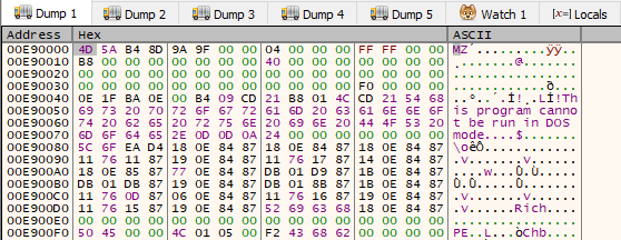 In x32dbg, it is necessary to breakpoints on the VirtualAlloc & VirtualProtect WinAPI functions. After three hits, a valid MZ* binary appears in the dump view.