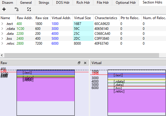 First, open the dumped file in PE-Bear and click on Section Hdrs tab.