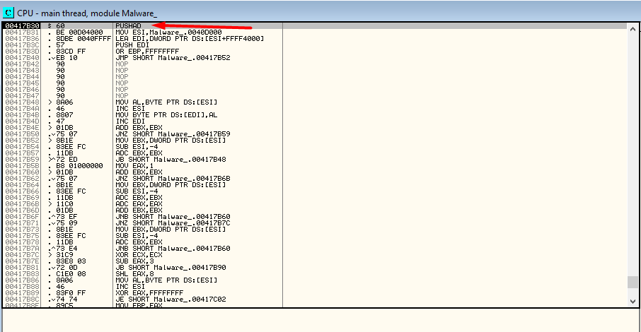 The Entry Point here is a PUSHAD instruction at 0x417B30. PUSHAD saves the 32-bit general registers on the stack. The Packer will remove from the stack before proceeding to original code execution.