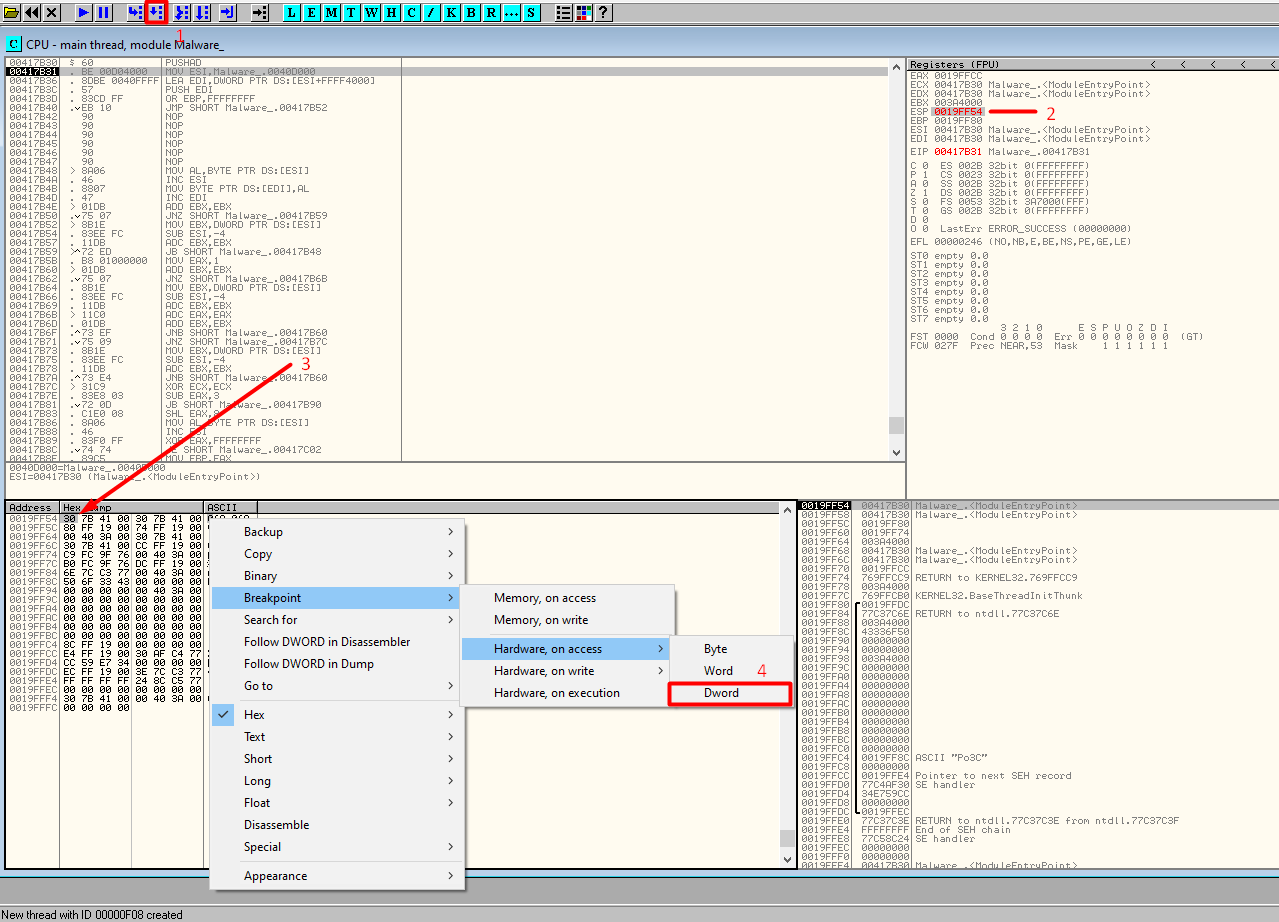 So, here we need to find a POPAD instruction that obviously makes the opposite of PUSHAD. To find it, we need to step over one time the Entry Point and look at the ESP register value. Next, we select “follow in dump” with a right-click on the ESP value to display the contents from the address in ESP. In addition, set a Hardware Breakpoint on access on the first data element on the stack (with right-click).