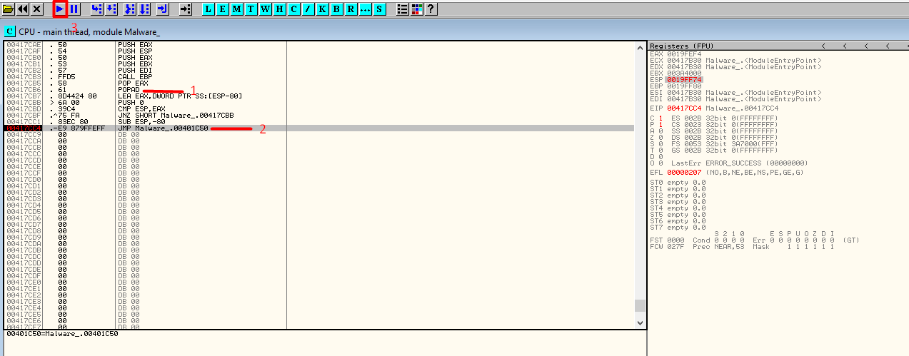 Next, set a software breakpoint — INT 3 — (Key F2 on the keyboard) on the JMP instruction. This instruction will jump to the Original Entry Point. Resume the execution and once the JMP is hit, step over it!