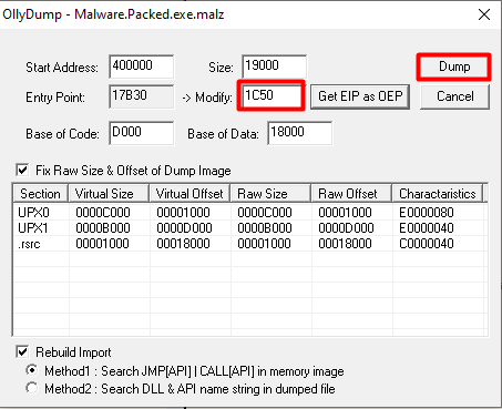 Now select Plugin → OllyDump → Dump Debugged Process (this will dump the process memory at the OEP). We verify the correct value of OEP and click “Dump”.